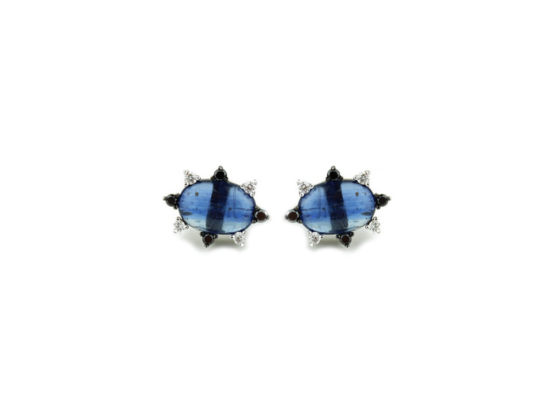 Arracades d'or blanc de 18Ktes. 8 brillants blancs i 8 brillants negres de 0.02cts, amb cianita oval cabujón. Tancament pressió.