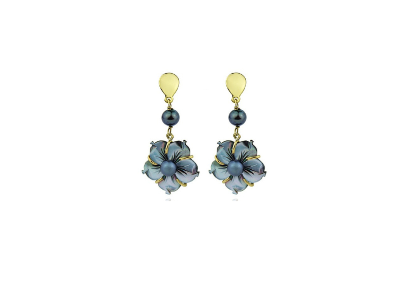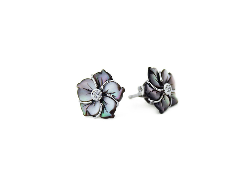 Collar d'espinella i or blanc de 18 Ktes., amb flor de nacre gris en or blanc. Diàmetre 20mm, amb brillant de 0.07cts.
