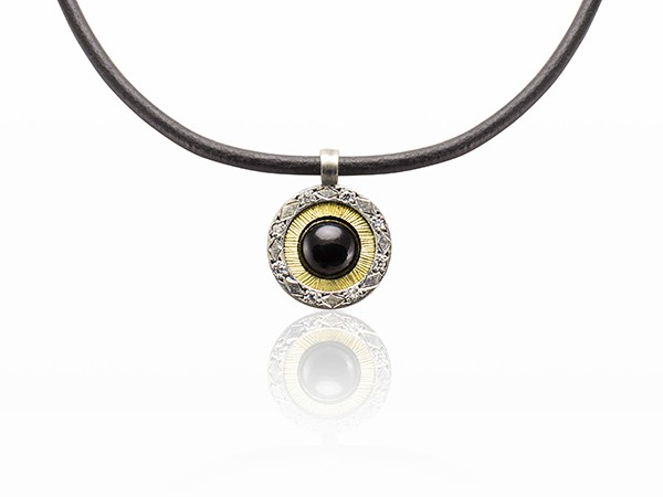 Penjoll de plata de llei mat rovellat amb bisell d'or groc de 18Ktes amb 8 diamants blancs de 0.02cts i ònix. *Aquest article no inclou el cuir.