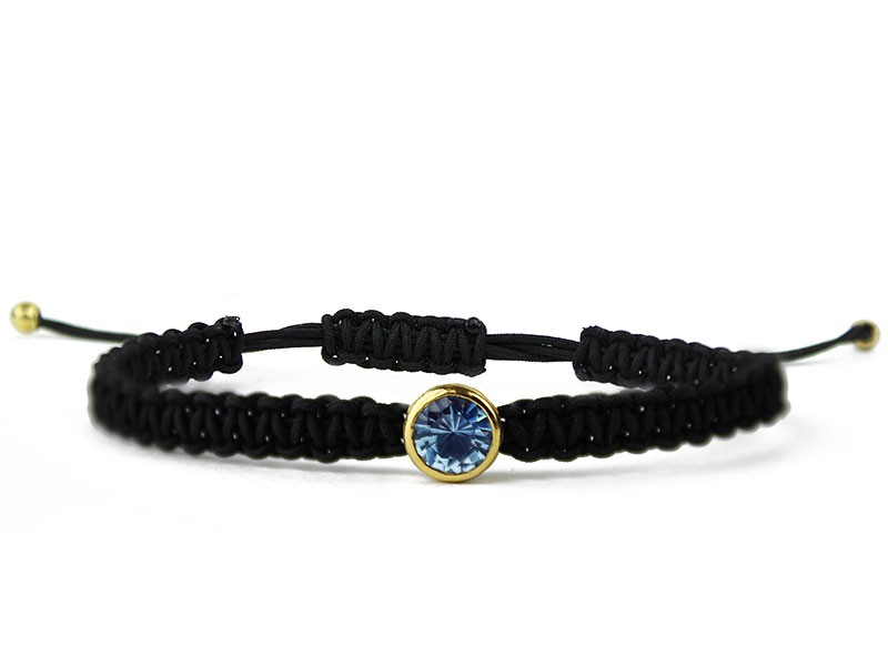 Polsera de macramé color negre, amb boca d´or groc de 18 Ktes. amb topazi blau de 6mm. Boletes d'or groc finals.
