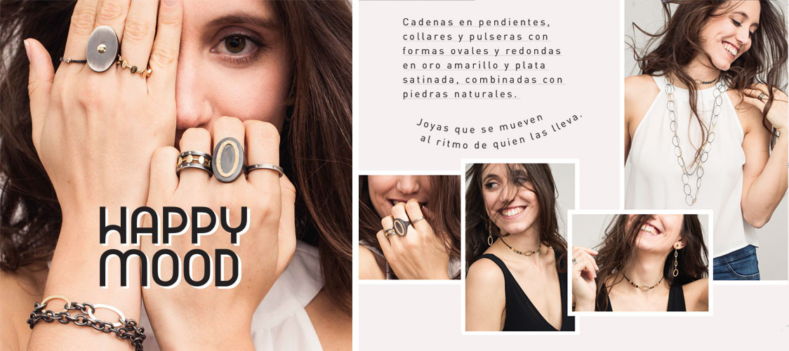 Cadenas en pendientes, collares y pulseras con forma ovales y redondas en oro amarillo y plata satinada, combinadas con piedras naturales.