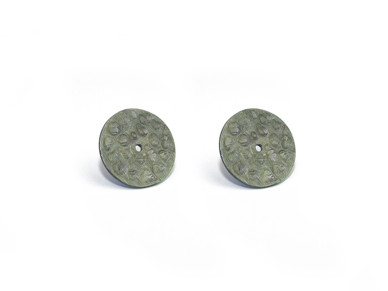 2 loose plates that can be attached to stud earrings with a push-button closure, making them larger. 925 sterling silver. Round piece with a hammered, oxidized, and matte finish. 12.30mm diameter.