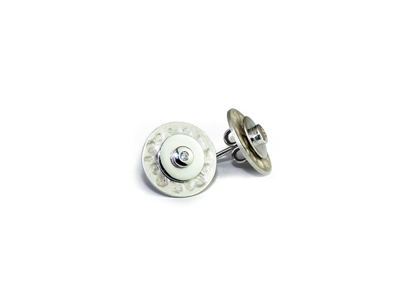 Earrings in 18k white gold. Natural diamond of 0.02ct each. Earring diameter 7.28mm. Push-back closure. Removable plates in matte white silver with a hammered finish. Diameter 12.30mm.