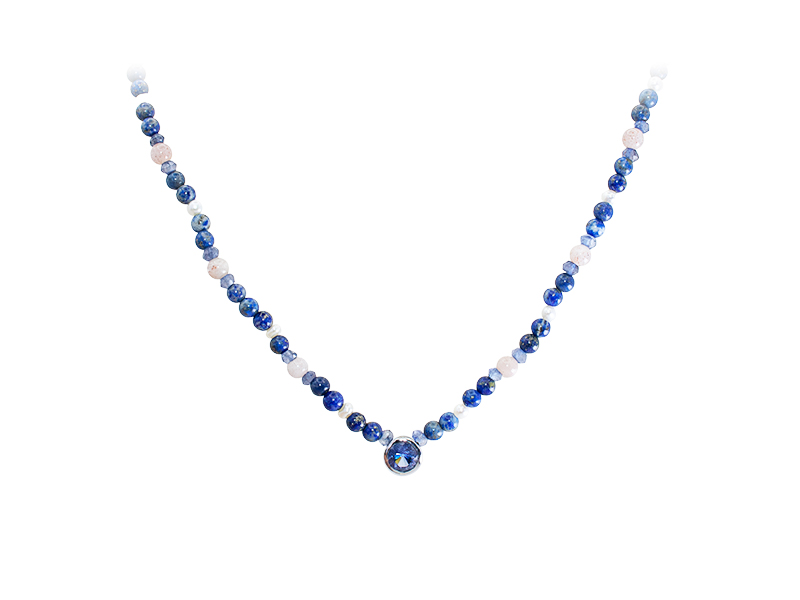 Collar de plata de 925 mm con piedras naturales de varios colores. Bolas de 4 mm de diámetro. Boca central de plata con iolita de 6 mm de diámetro.