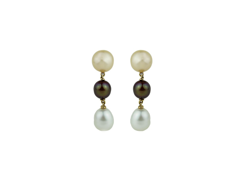 Long earrings with three pearls pierced with 18K yellow gold wire. 11-12mm pink pearl, 9-9.5mm brown pearl, 10-11mm white pearl, and freshwater pearls.