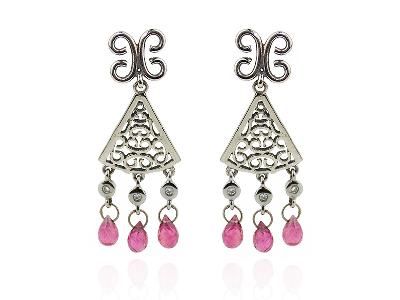 18kt white gold earrings with six 0.02ct brilliant-cut diamonds, each finished with briolette-cut pink tourmalines. Push-back closure.