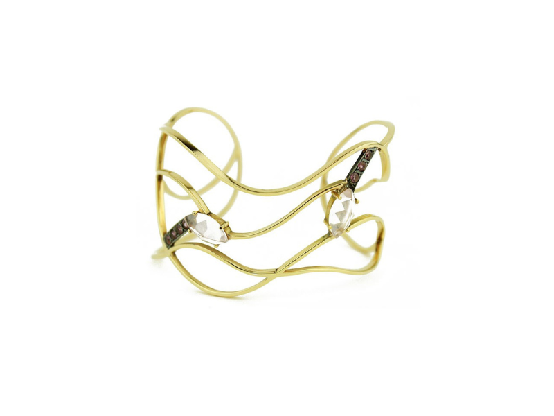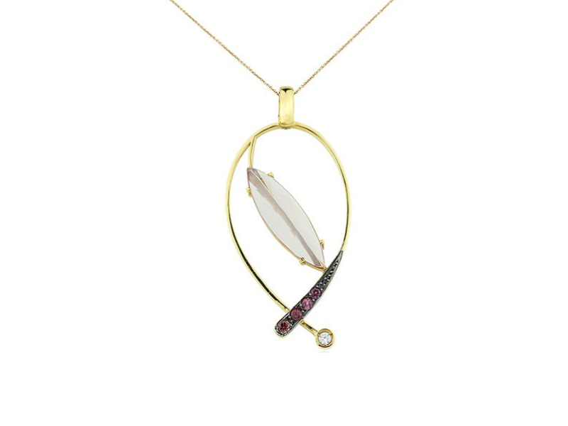 Gold earrings with rose quartz, rhodonite and diamonds.