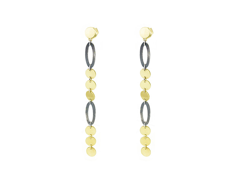 Long earrings combined with two 925mm satin-finished silver plates and six polished 750mm yellow gold plates, each 6mm in diameter. The piece resting on the oval measures 6mm in diameter. 750mm gold pressure clasp. Total measurement: 7.5cm.