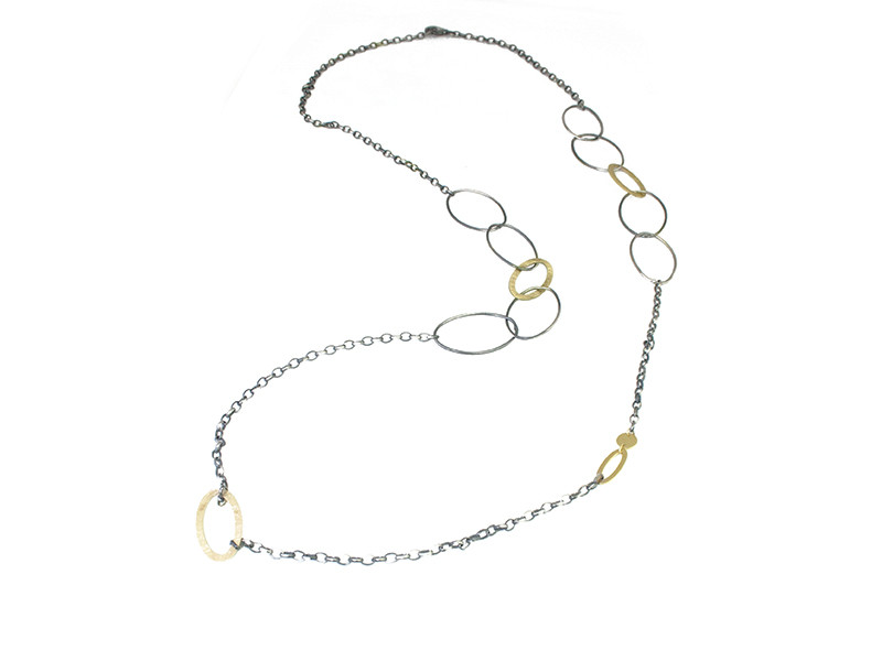 Long necklace combined with a fine chain, with oval beads in 925mm satin silver measuring 2.70cm x 1.5cm and four beads in 750mm yellow gold measuring 2.2cm, in a matte finish, and one bead and one 6mm plate in a polished finish. Total measurement: 84cm.
