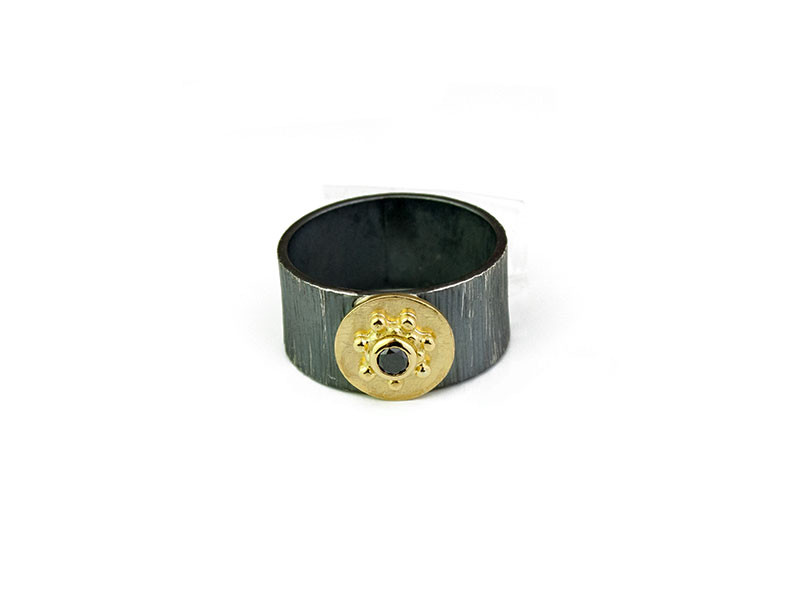 Oxidized silver ring, striped texture with 750mm yellow gold center and brilliant-cut black diamond.