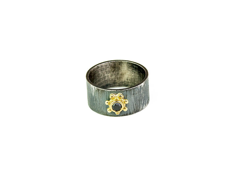 Oxidized silver striped ring with a 750mm yellow gold center and a brilliant-cut black diamond.