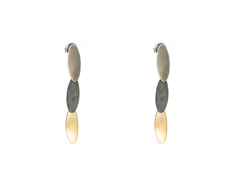 Pendientes de plata 925 mm y oro de 18 ktes. Acabado mate. Largo 4,5 cm. Combinación de plata blanca, de plata oxidada y oro amarillo.