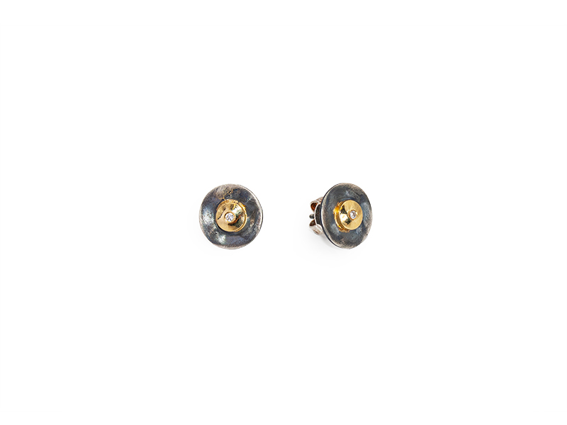 Pendientes de plata de 925 mm oxidada y oro amarillo de 18 kt, con un diamante natural talla brillante de 0,03 cm. 1,2 cm de diámetro. Cierre presión.