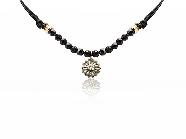 Necklace with a small flower motif in matte oxidized sterling silver, 18K yellow gold setting and 0.02ct white diamond, with onyx and silk.