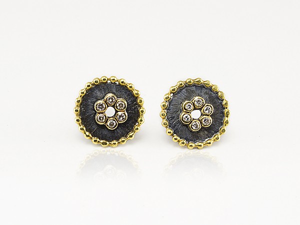 Matte oxidized sterling silver earrings with an 18kt yellow gold rim and openings, set with 12 white diamonds, each weighing 0.02 ct. Push-back closure.