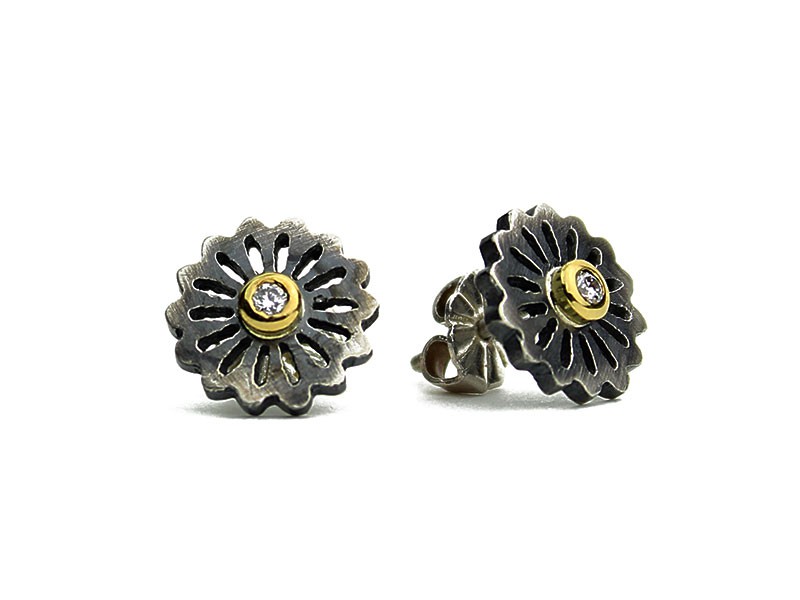 Oxidized silver earrings with 18-karat yellow gold studs and 0.03-ct brilliant-cut diamonds. Push-back closure. 10-mm diameter flower.