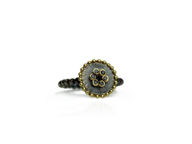 Oxidized silver ring with 18K yellow gold, and 6 black diamonds of 0.01 cts.
