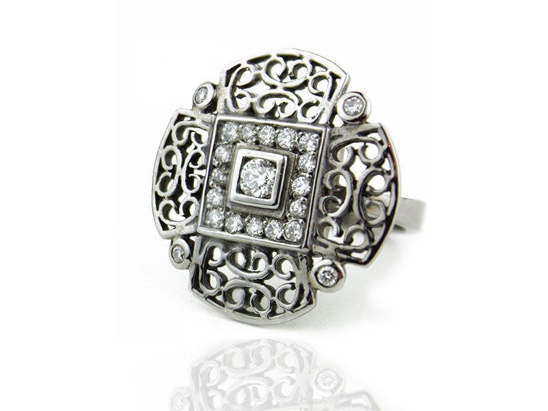 18K white gold ring, black rhodium-plated silver arm, with a 0.24 ct central brilliant and 20 0.03 ct brilliants.
