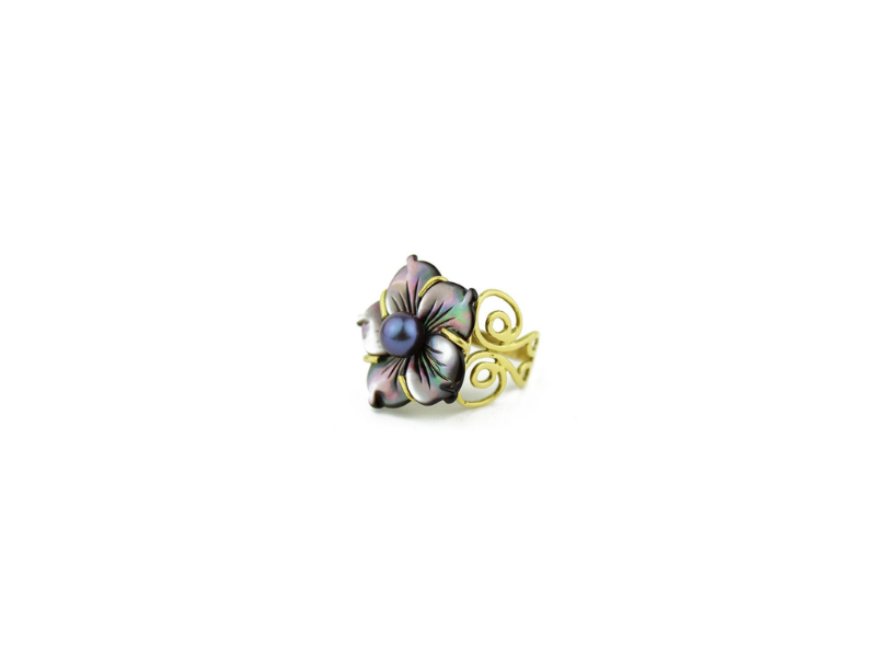 Yellow gold ring, mother-of-pearl flower and grey pearl.
