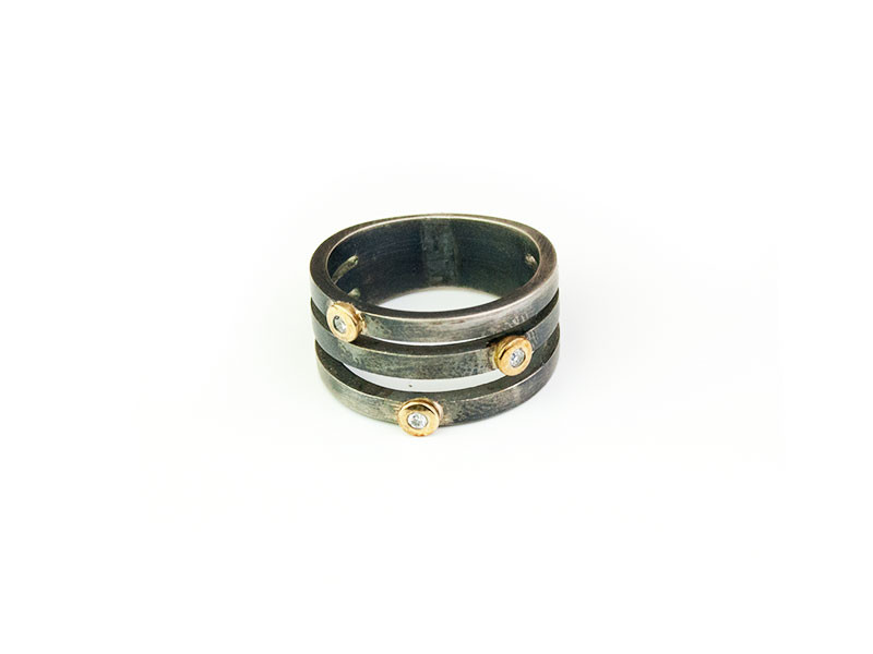 Anillo de tres brazos de plata oxidada de 925mm y 3 bocas en oro amarillo de 750mm con tres diamantes talla brillante blancos, de 0.02cts cada uno.