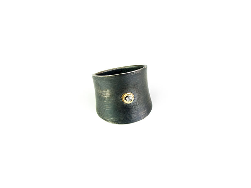 Anillo en plata de 925mm oxidada de brazo ancho liso, mate, con una boca redonda de oro amarillo de 750mm y un Diamante talla brillante de 0.02cts.
