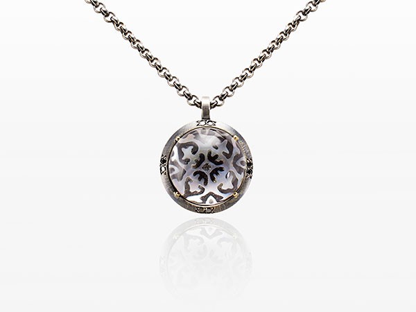 Colgante de plata de ley mate oixidado, grapas de oro amarillo de 18Ktes.Doblete de nácar tallado y cristal de roca.8 diamantes negros de 0.02cts.
