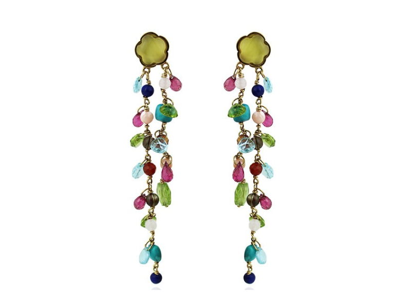 Pendientes de oro amarillo de 18Ktes. parte superior en forma de flor con piedra Luna, dos tiras en cascada con piedras de Topacio azul, Lapislázuli, C. Rosa, C. Fume, Peridoto, Turmalina Rosa y Turquesa. Cierre presión.