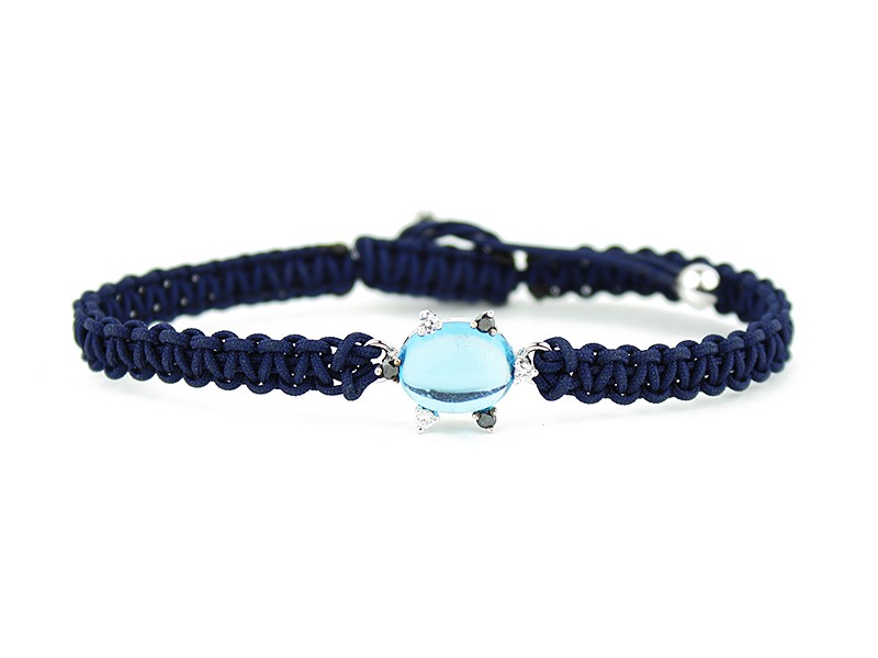 Pulsera de macramé azul con centro de oro blanco de 18Ktes con topacio azul oval cabujón, con 3 brillantes blancos y 3 brillantes negros de 0.02cts.